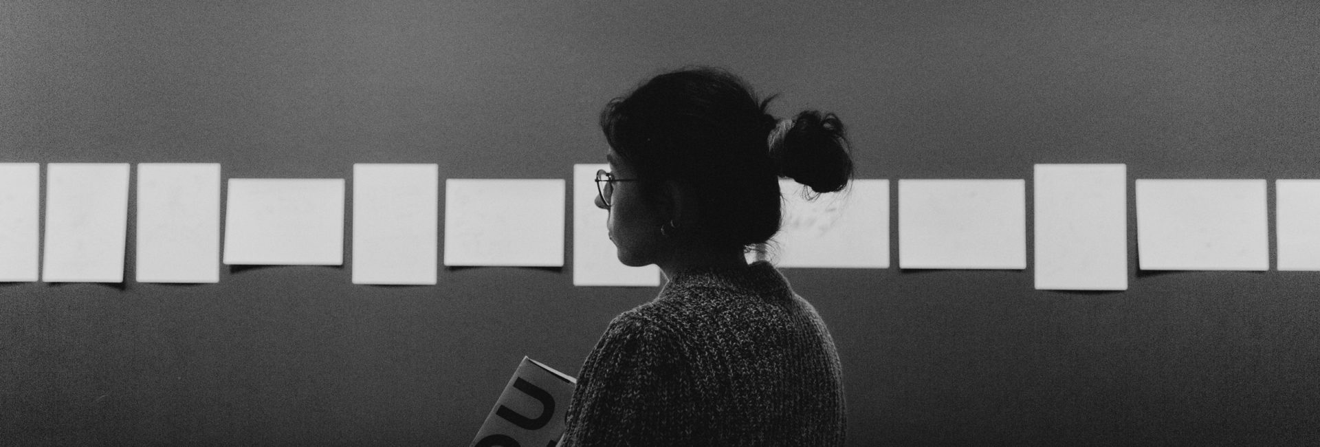 Kjeld Kjeldsen viser rundt i udstillingens næste rum. En hel række af hvide papirer med tegninger af gange, rum og arabisk skriftsprog hænger på en sort væg og flagrer let i luften.